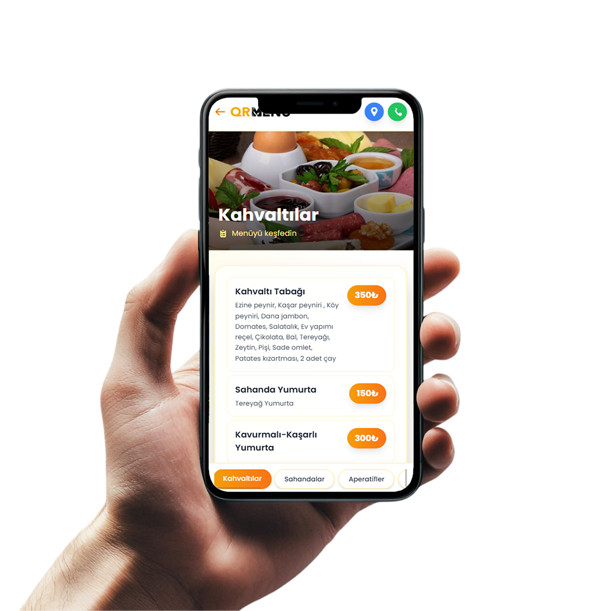 Müşterileriniz masada yer alan QR kodu telefonuyla okutarak, hiçbir uygulama indirmeden menünüze anında ulaşır.